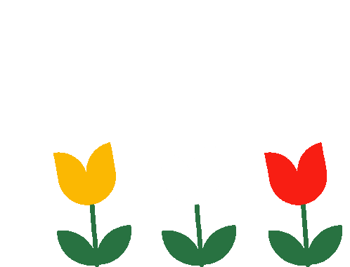 Three colorful tulips, one yellow, one red, and one with just leaves, sway gently from side to side as if in a breeze.