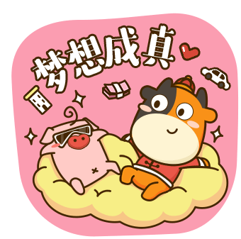 Tuniu's animated sticker features a cute cow in traditional Chinese attire and a pig with sunglasses, relaxing on a cloud as their dreams of money, a house, and a car come true. Text reads 'Dreams Come True'.