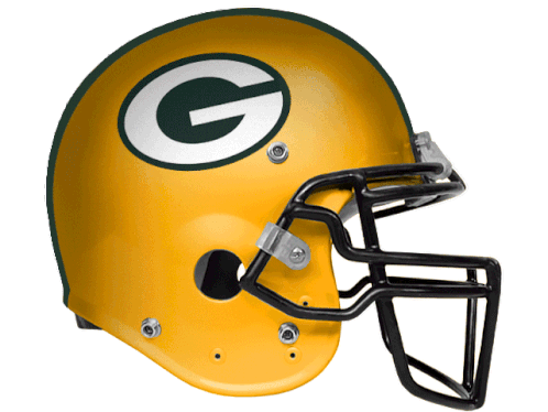 Green Bay Packers football helmet, featuring the iconic 'G' logo and team stripes, celebrating Turkey Bowl and Super Bowl history.