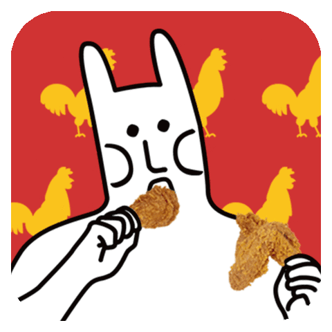 A quirky white cartoon character with long ears happily devours two pieces of crispy fried chicken legs.