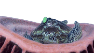 A green sea turtle with a green tag on its shell is peacefully resting in a vibrant pink coral formation.