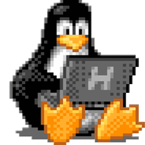 Tux, the iconic Linux penguin mascot, is depicted in pixel art, diligently coding on a laptop with an 'H' on its screen.