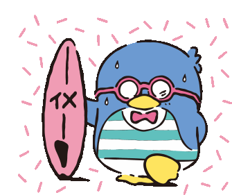 Tuxedo Sam, the adorable penguin, ready to surf with his pink board and stylish glasses.