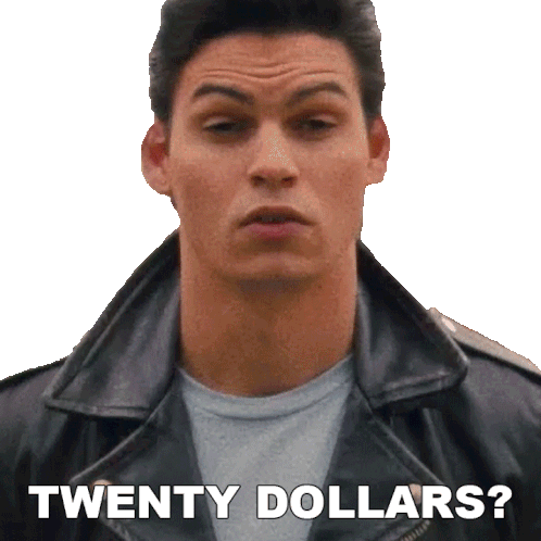 Gil, portrayed by Nicholas McDonough from 'Grease: Rise of the Pink Ladies', asks 'Twenty Dollars?' with a surprised expression.