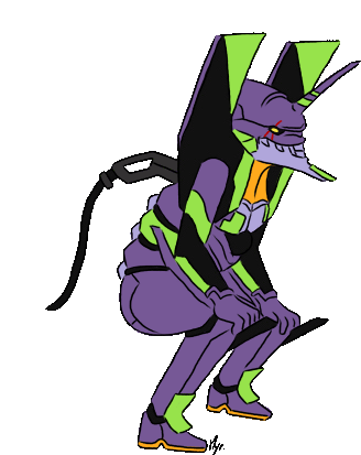 A vibrant cartoon Evangelion robot, purple and green, performing a dynamic twerking action with a gas pump on its back.