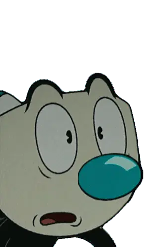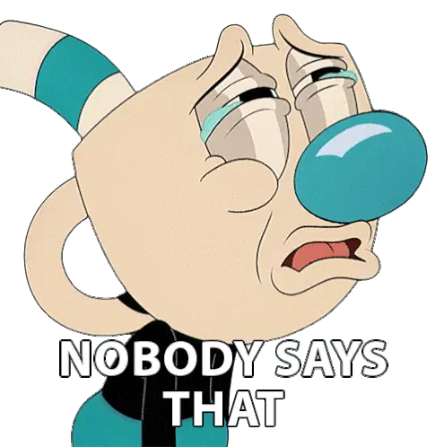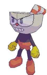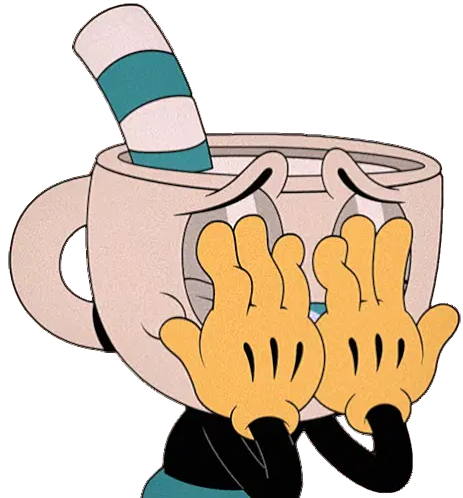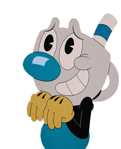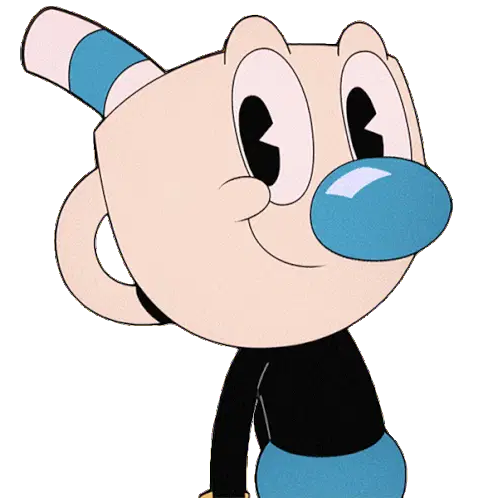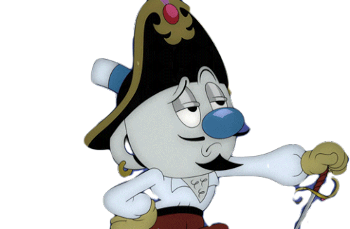 Mugman from The Cuphead Show, dressed as a swashbuckler, twirls his mustache with a sword in hand, looking contemplative.
