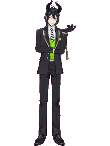 maleficent from twisted wonderland is wearing a suit and tie and has horns .
