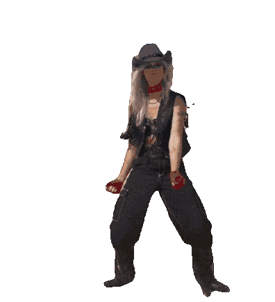 Annelle Staal, dressed as a cowgirl, performs a lively dance with energetic arm movements and a confident pose.
