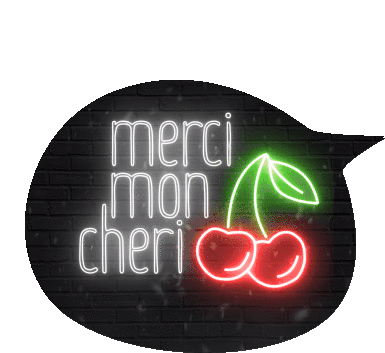 A neon sign in a speech bubble glows with 'merci mon cheri' and two red cherries, flickering on and off.