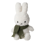 a white stuffed bunny is wearing a green scarf