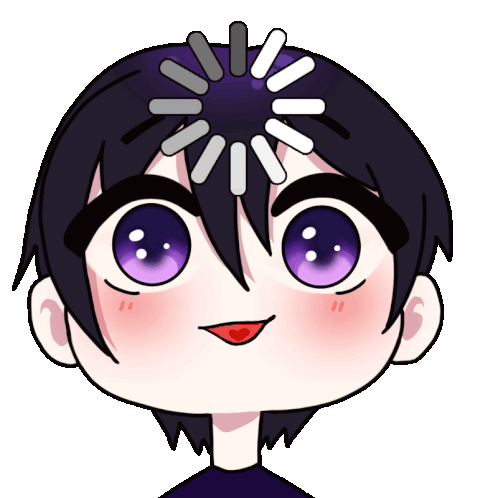 An adorable anime-style boy, Ua Vtuber, with purple eyes and a loading wheel on his head, indicating a moment of thought or processing.