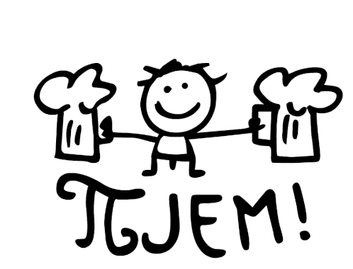A cheerful Uax Design stick figure celebrates with two mugs of foamy beer, accompanied by the text 'PIJEM!' (I drink!). Perfect for party vibes.