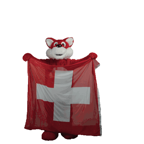 Animated mascot shaped like the Swiss flag, representing UBS Switzerland for EM 2024 and Euro 2024 events.
