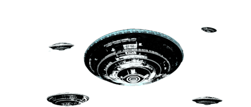 Multiple animated UFO spaceships, dark and metallic with blue accents, hover and move subtly against a clear background.