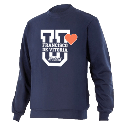 Dark blue sweatshirt featuring the white logo of Universidad Francisco de Vitoria Madrid with an orange heart.