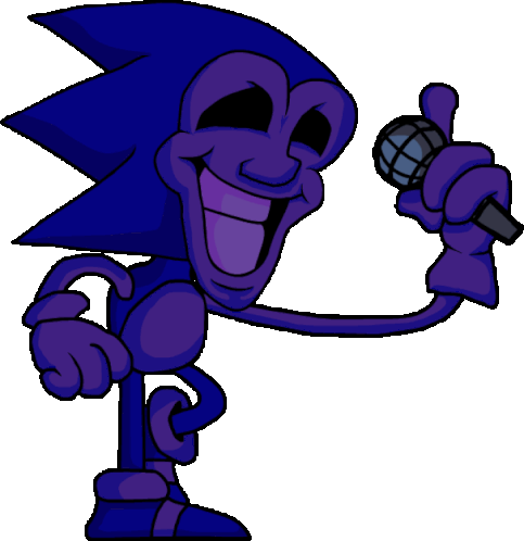 A creepy blue and purple hedgehog-like character with a wide grin holds a microphone, swaying rhythmically.