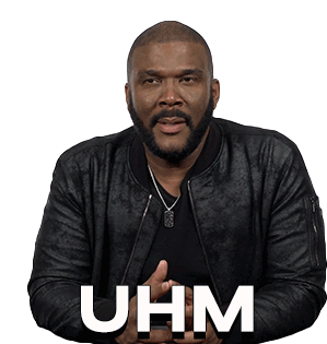 Tyler Perry, wearing a black jacket, looks thoughtful with the caption 'UHM' displayed, expressing hesitation.