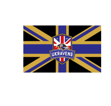 A fan sticker featuring a stylized Union Jack flag in black, gold, and blue, with a Baltimore Ravens-inspired "UKRAVENS" logo shield in the center.
