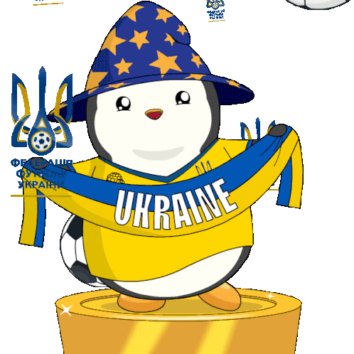An adorable penguin mascot in a Ukraine football jersey and wizard hat, holding a 'UKRAINE' banner.