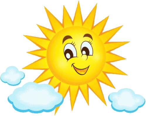 a cartoon sun with a smiling face and clouds behind it