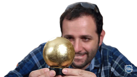 Ibere Thenorio smiles while holding a perfect golden ball, showcasing his creation from Manual do Mundo.