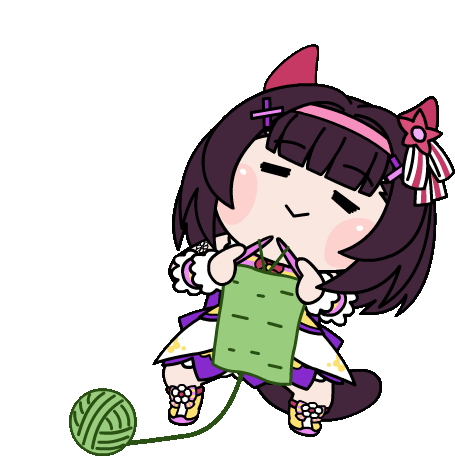 Chibi Umamusume Pretty Derby girl with cat ears knitting a green scarf with yarn.