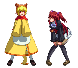 Sakutaro in a yellow coat and Ange Ushiromiya in a school uniform, both from Umineko, posing in pixel art style.