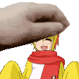 A gentle hand pets Sakutaro from Umineko When They Cry, making the adorable character blush happily.