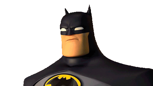 Batman, in a stylized 3D animation, expresses disapproval or thoughtful hesitation with an "umm" or "hmm" look.