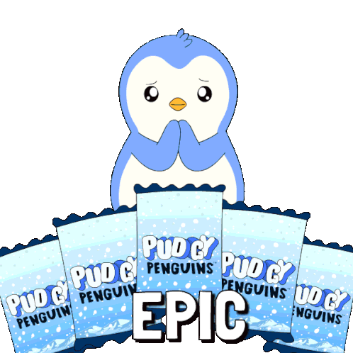 a blue and white penguin standing next to a card that says epic
