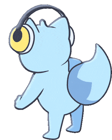 A cute, light blue, one-eyed creature from Uncovered Studio Nimai wearing headphones and dancing energetically.