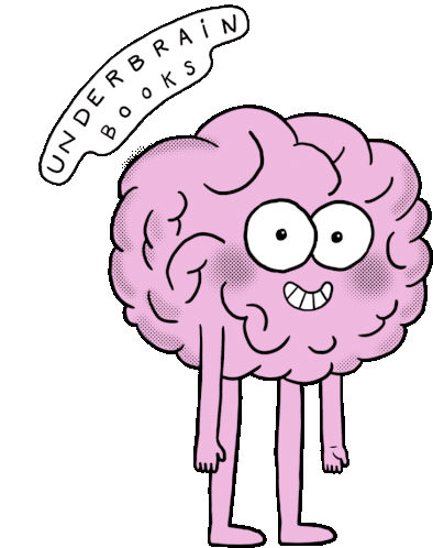 A pink cartoon brain from Underbrain Books with wide eyes and hands on its cheeks, expressing surprise or shock.