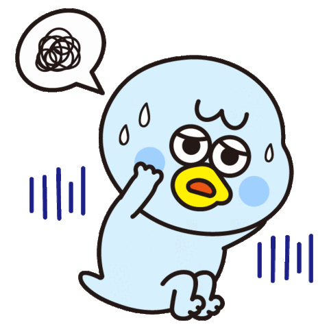 A light blue bird character looks uneasy and worried, with sweat drops and a thought bubble indicating distress.