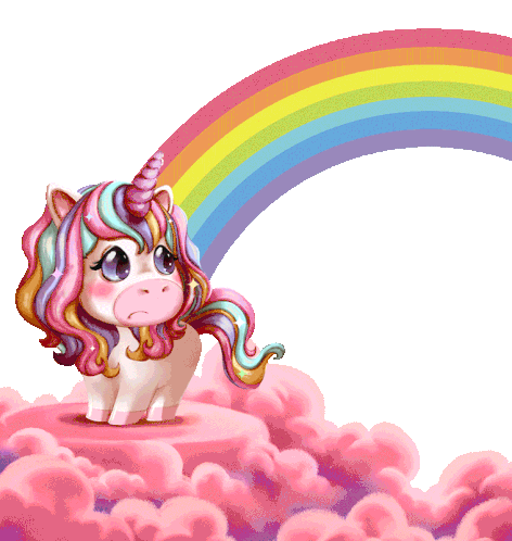 A cute unicorn with rainbow hair stands on pink clouds under a 'Happy Birthday' rainbow, perfect for celebrations.