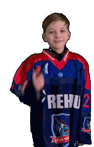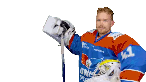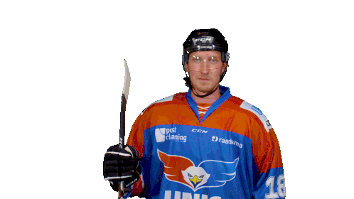 Ice hockey player Kenny Welles of Unis Flyers celebrates a goal or victory, smiling and raising his arm.