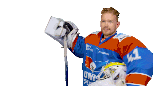 Ice hockey goalie Martijn Oosterwijk of Unis Flyers, wearing his blue and red jersey, smiles while holding his stick and helmet.