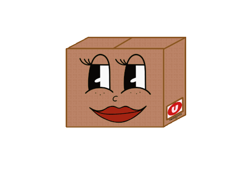 A playful Unishippers shipping box winks flirtatiously, featuring a cute face with red lips and freckles.