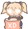 Mika from Under Night In-Birth sits dazed in a barrel with 'XD' on it, perfect for a silly or 'bonk' reaction.