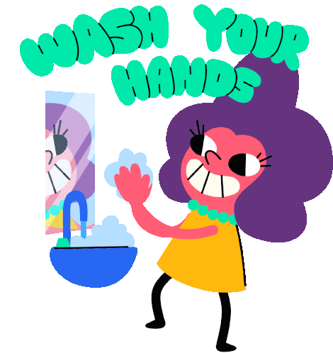 Cartoon character enthusiastically washes hands with soap and water, promoting hygiene and safety.