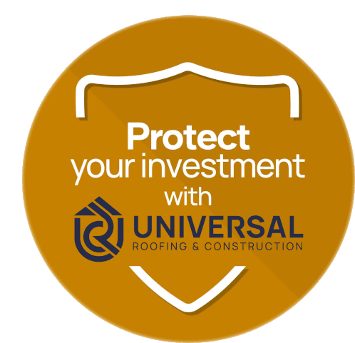 A protective shield icon with the text 'Protect your investment with Universal Roofing & Construction' and their logo.