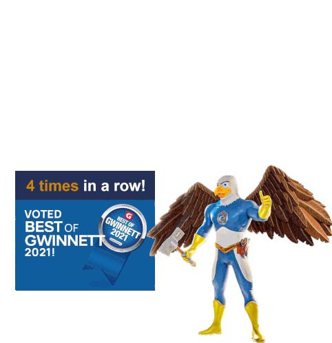 URC Man, the superhero mascot for Universal Roofing And Construction, celebrates being voted 'Best of Gwinnett 2021' for the fourth consecutive time.