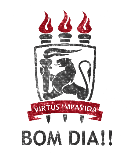 An animated UFPE sticker featuring its crest with 'Virtus Impavida' and a sparkling 'Bom Dia!' message.