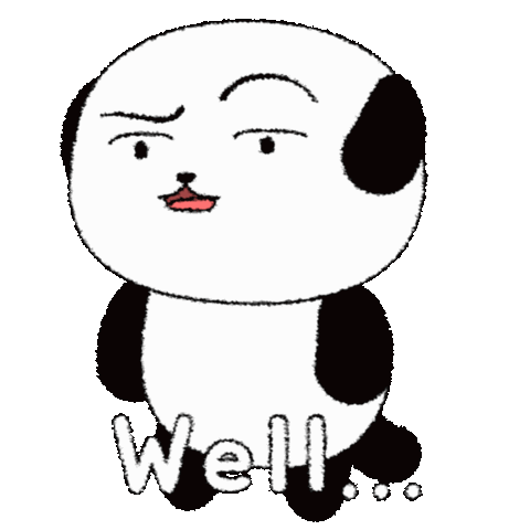 A skeptical panda-like dog character with a raised eyebrow and the caption 'Well...' expresses unimpressed doubt.
