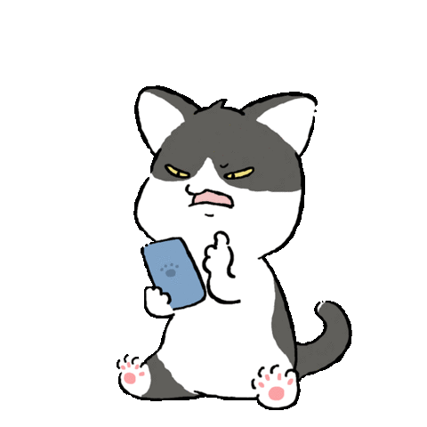 A grumpy cartoon cat sits, holding a blue smartphone, with an angry emoji floating nearby, showing clear dissatisfaction.