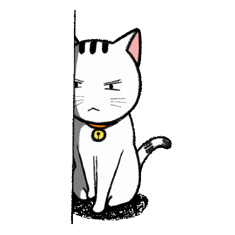 A white cat with a skeptical and annoyed expression peeks from behind a wall, wearing an orange collar.