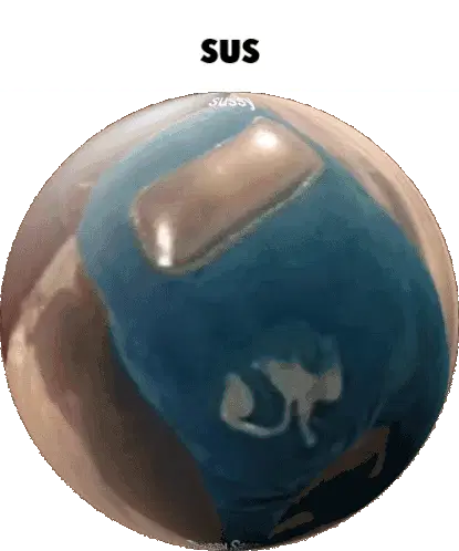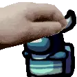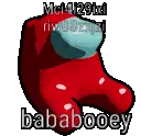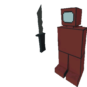 A red blocky character, resembling an Among Us crewmate or robot, stands next to a black knife.