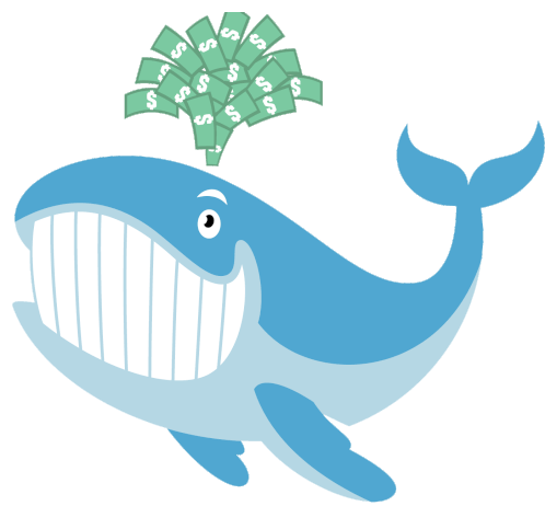 An 'Unusual Whales' character, a blue whale, wears pixelated 'Deal With It' sunglasses and has money on its head.