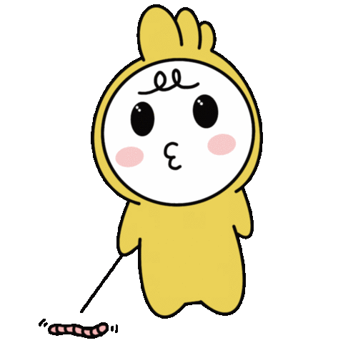 A cute chick character in a yellow costume with an unwilling and dull expression pokes a wiggling pink worm.
