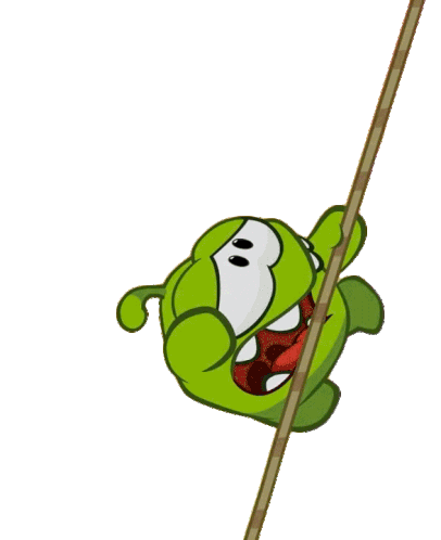 Om Nom struggles to climb a brown rope, showing determination in an uphill battle.