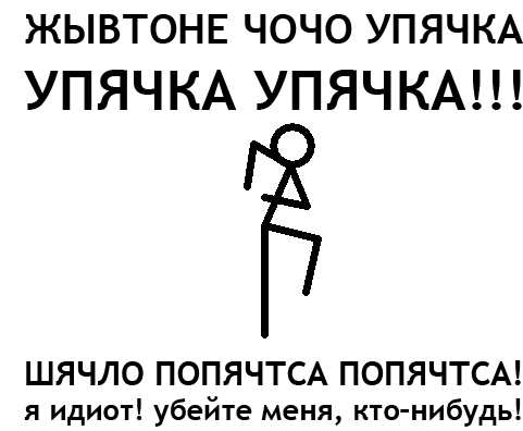 Russian internet meme 'Upryachka' featuring a stick figure in a squatting pose with nonsensical text and the phrase 'I am an idiot! Kill me, someone!'
